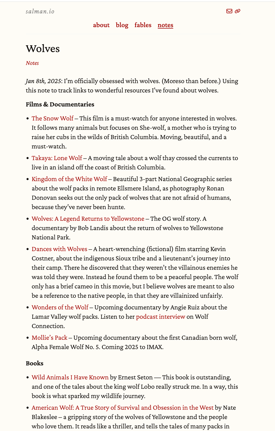 In anticipation of this trip, Iāve spent the last couple of months immersing myself in books, films, and documentaries about wolves. I compiled a list of my favorites into a new note on my site: