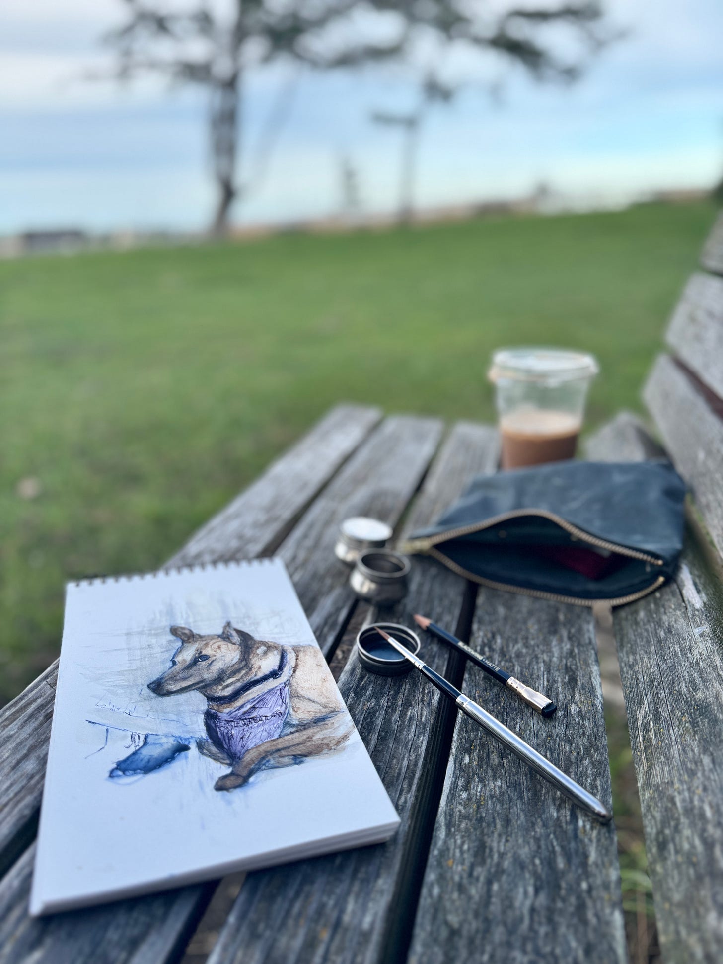 To honor Aloka, I took some time to sketch him while out on a shoreline park. I somehow forgot my paint palette at home, so I made do by working with pen and pencil, and applying a wash using the coffee-stained water from my iced mocha. We artists must make the most of what tools we have!