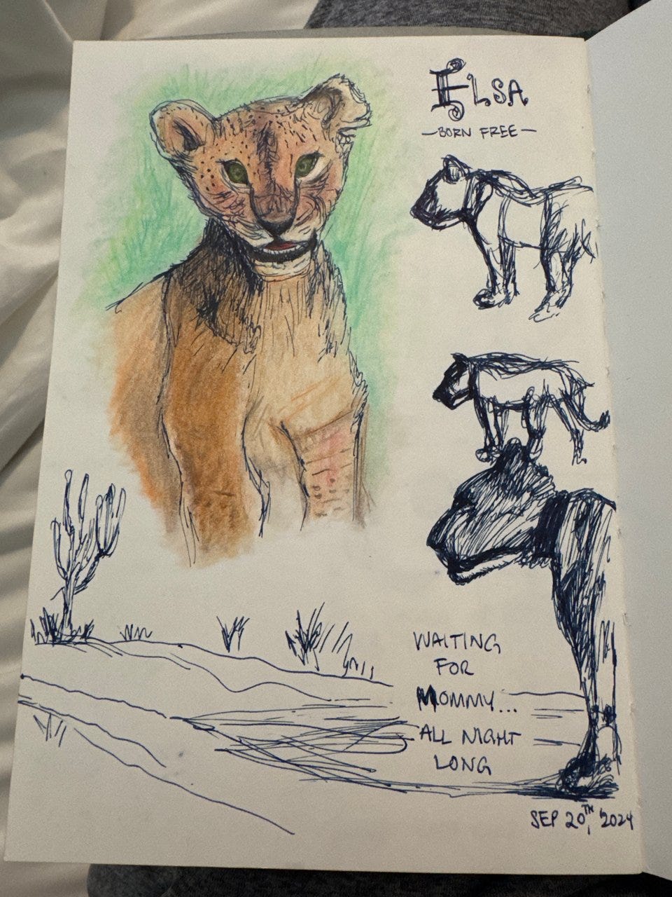 Hereās a quick sketch I did while watching Born Free, capturing the heart-wrenching moments when Elsa watches her (human) mother leave her side.