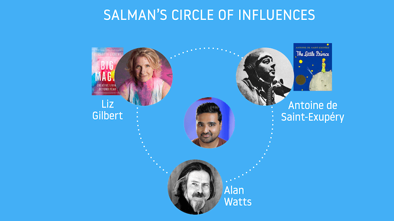 Earlier this year, I presented this slide to students in my Write of Passage mentor group. I spoke about three of my biggest creative inspirations: Alan Watts, Liz Gilbert and Antoine de Saint-Exupéry.